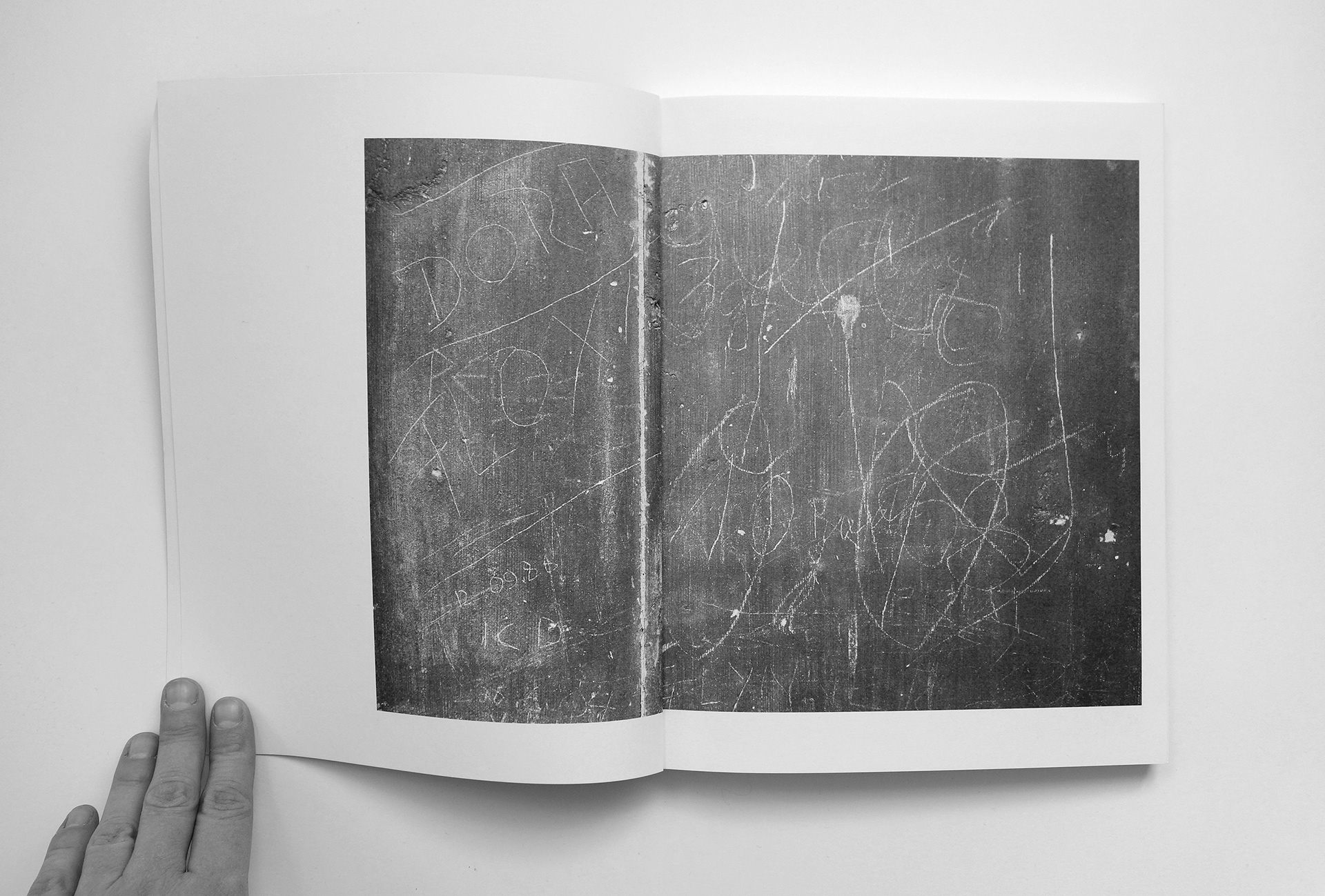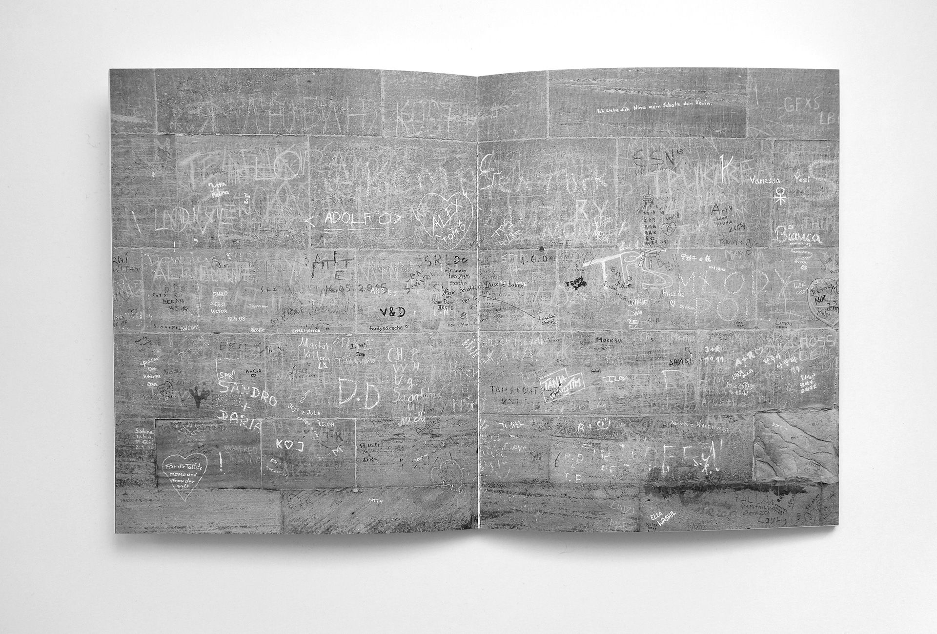 The photo project here is dedicated to the (pop)cultural phenomenon of graffiti in public space. The artist book shows a collection of graffiti and scratchings found on the walls of Colognes Cathedral. The cathedral, landmark but also cliché of the city of Cologne, becomes the carrier material of a collective memory practice that inscribes itself directly into the walls of the cathedral. Significantly, the word hier/here refers to the fact that a person was actually present at the designated location. The sign thus serves as evidence and direct reference to the creators. When the creators leave the place, the signs become messages of their absence. As a link between interior and exterior space and between private and public space, the wall serves as a medium and storage for the graffiti. Through continuous overwriting and weathering, numerous superimposed layers of signs are created that remain stored in the material, similar to a memory, at least as traces.
