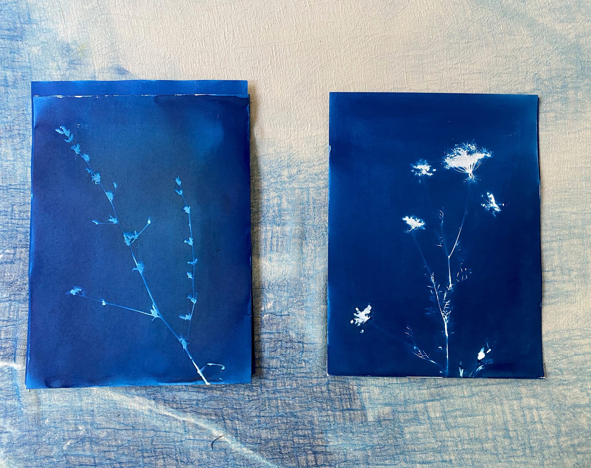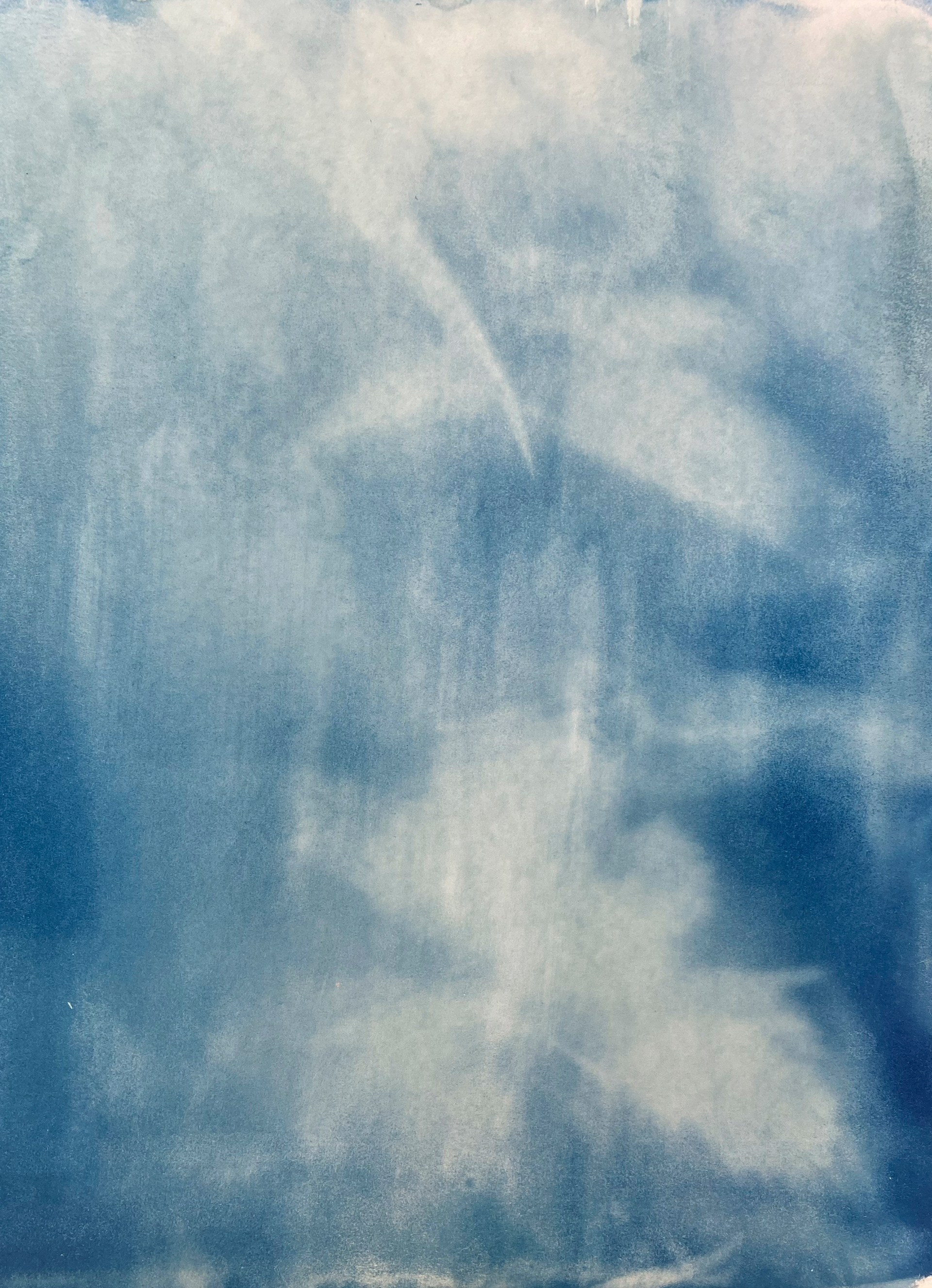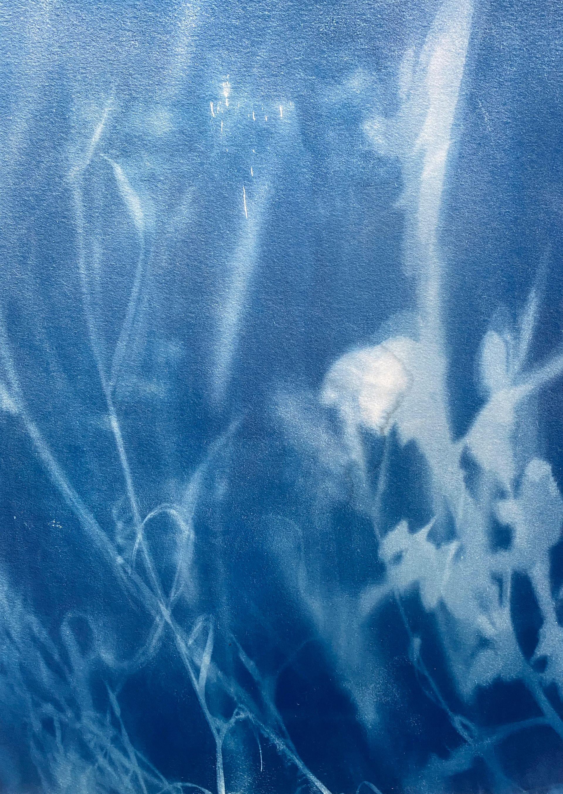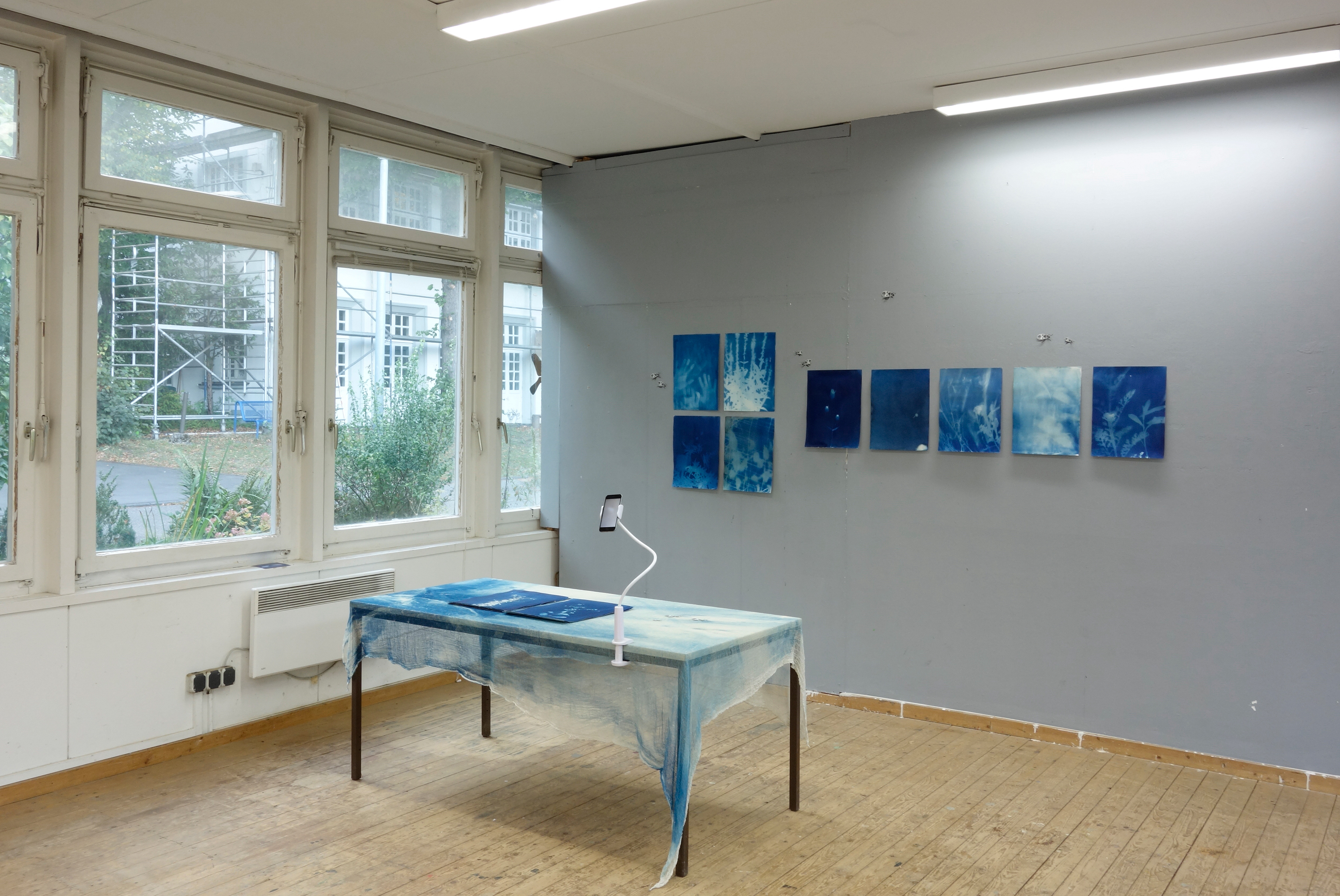 For my work scholarship from the Dormagen Guffanti Foundation, I developed a project with the residents of the center for the disabled that consisted of the photographic printing process cyanotype and classic, analogue photographs. The residents were able to “take a picture” of their surroundings themselves with the help of an easy-to-use film camera. Cyanotypes are photograms in which a carrier material (e.g. paper) is exposed directly using a contact process, without the use of a camera. The works produced using one of the oldest photographic techniques thus depict their own creation process on the surface. The process is based on the most basic elements of photography: an object, light and light-sensitive material. The process can only be controlled to a certain extent, the result depends on the duration of the exposure, the type and amount of UV light and the concentration of the chemical substances. Every print is a surprise, a mystery, unique.