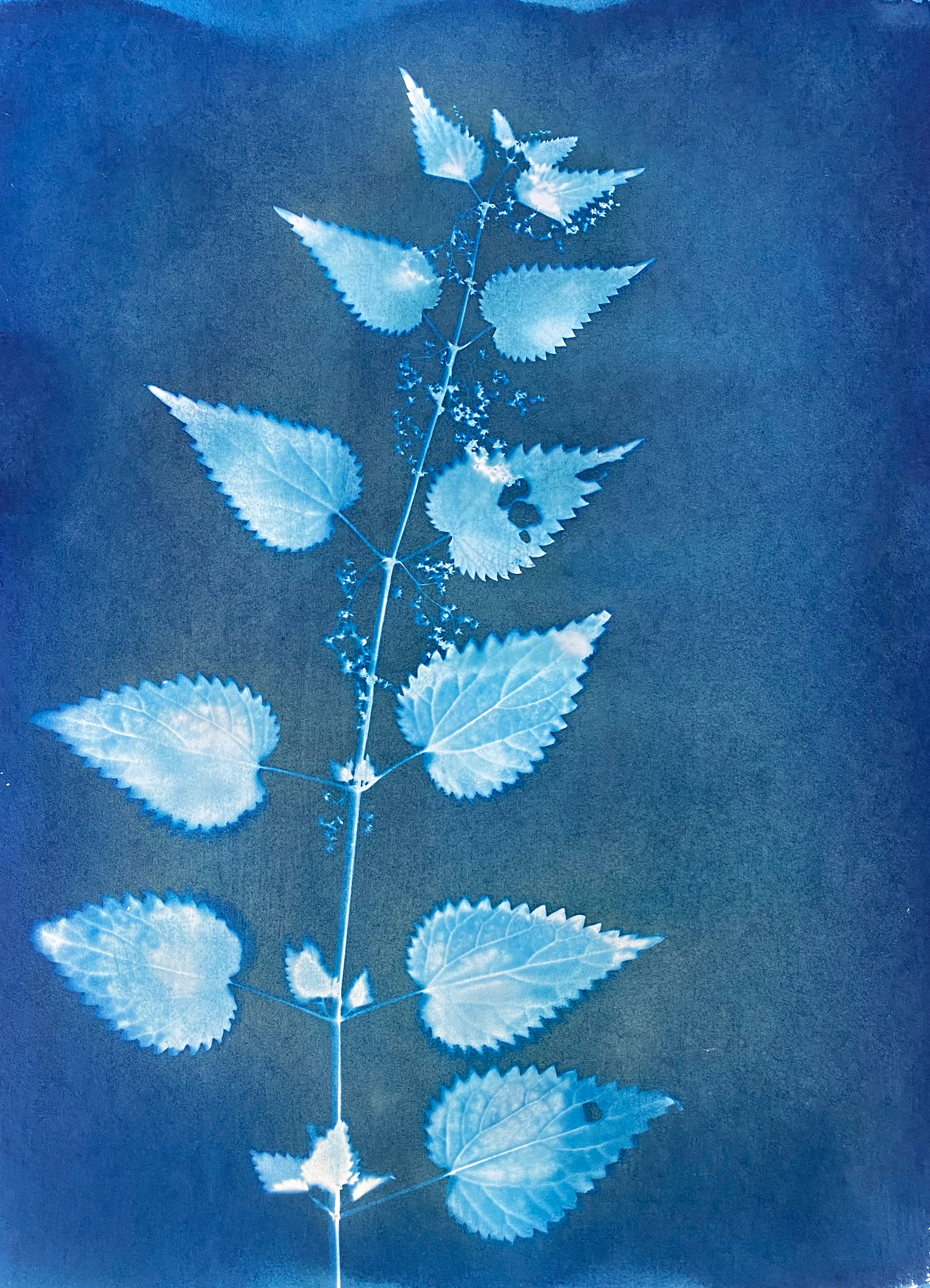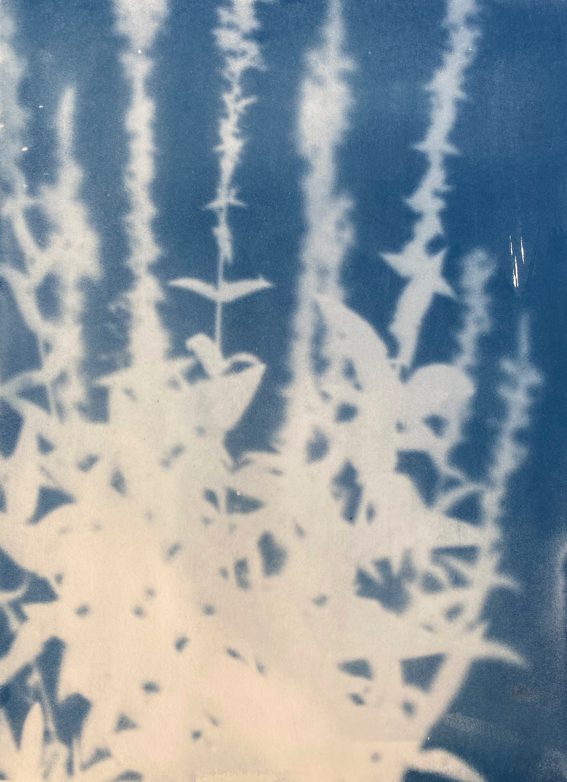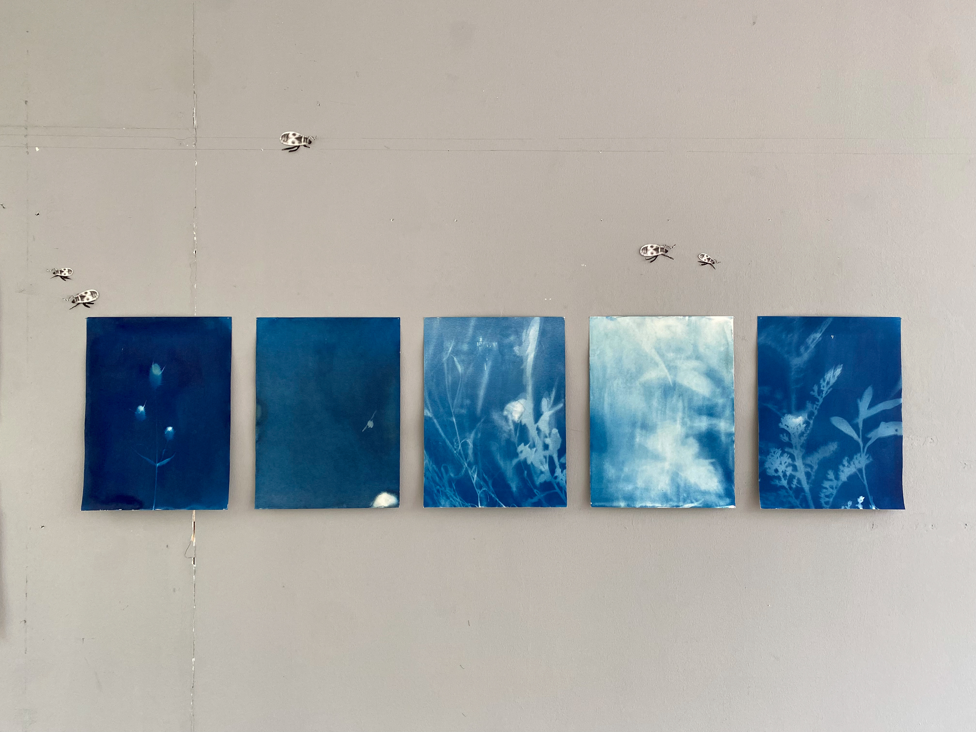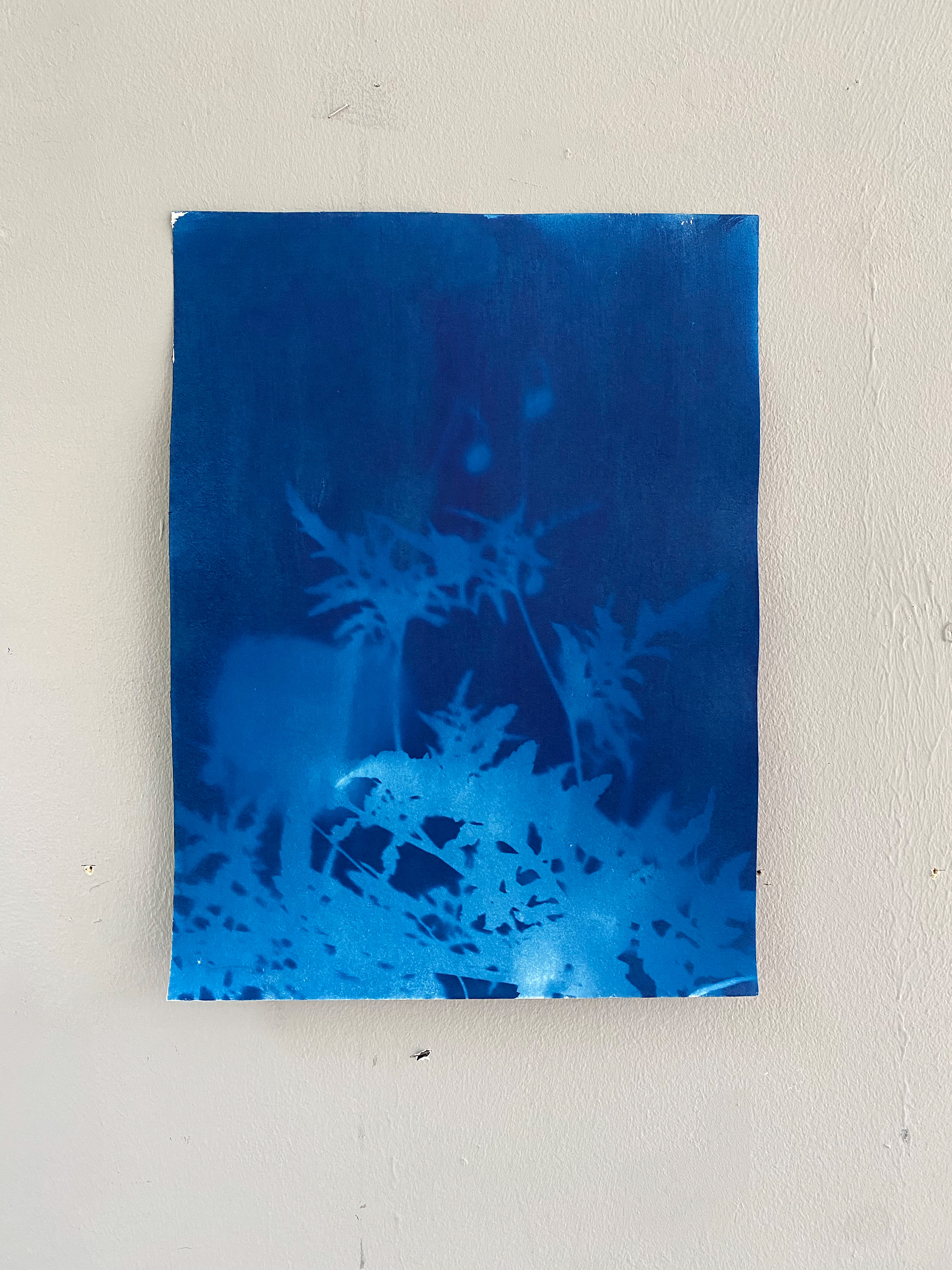 For my work scholarship from the Dormagen Guffanti Foundation, I developed a project with the residents of the center for the disabled that consisted of the photographic printing process cyanotype and classic, analogue photographs. The residents were able to “take a picture” of their surroundings themselves with the help of an easy-to-use film camera. Cyanotypes are photograms in which a carrier material (e.g. paper) is exposed directly using a contact process, without the use of a camera. The works produced using one of the oldest photographic techniques thus depict their own creation process on the surface. The process is based on the most basic elements of photography: an object, light and light-sensitive material. The process can only be controlled to a certain extent, the result depends on the duration of the exposure, the type and amount of UV light and the concentration of the chemical substances. Every print is a surprise, a mystery, unique.